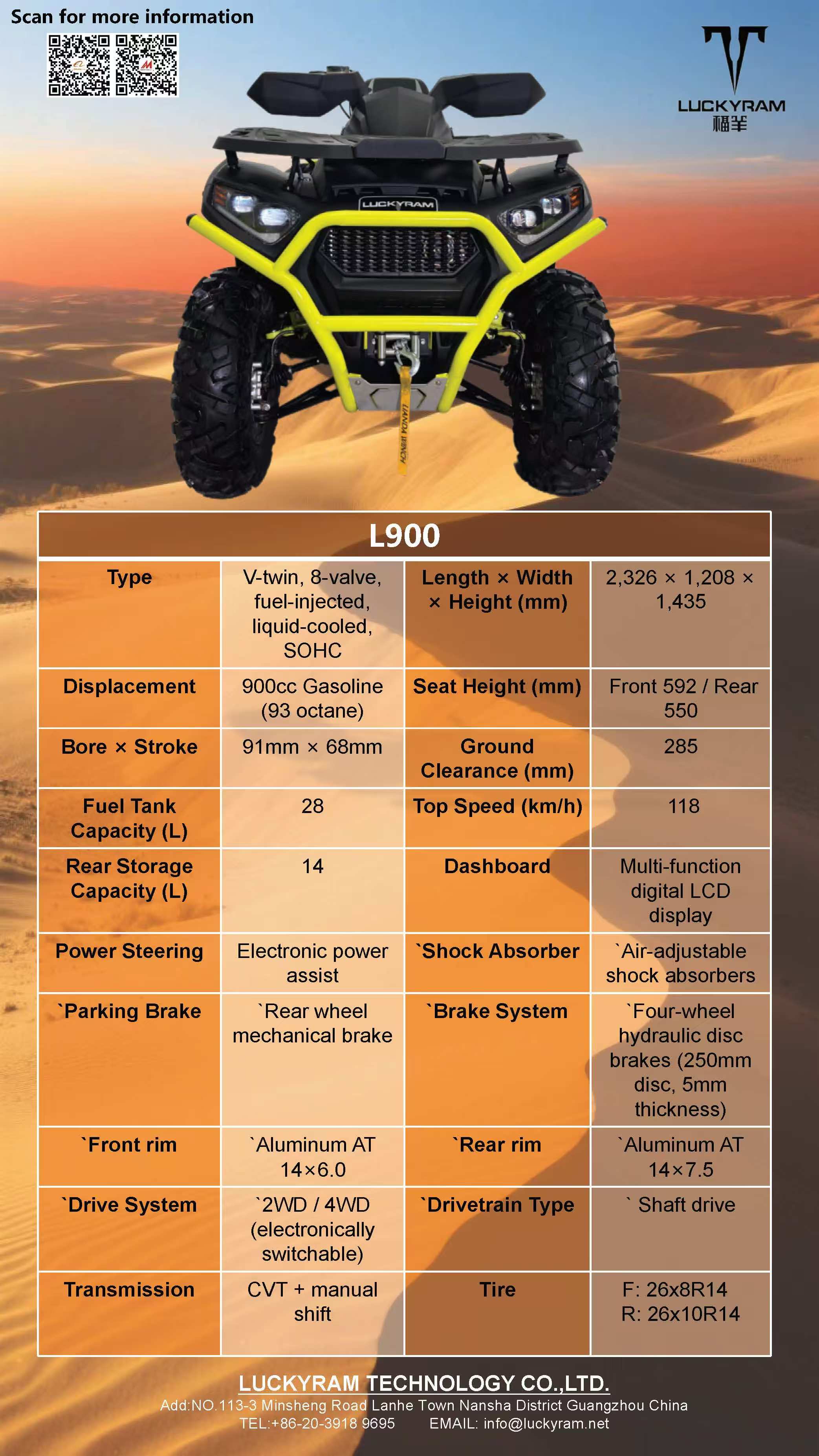 शक्तिशाली ईन्जिन - एक उच्च प्रदर्शन 900. स्ट्रोक इञ्जिन को साथ सुसज्जित, एक उच्च twarains निलम्बन को लागी helperation helpsization को साथ संपर्क एक सजीलो हिलो, बालुवा, र चट्टान ट्रेल्सहरू। हाइड्रोलिक डिस्क ब्रेक (फ्रन्ट र रियर) छिटो गतिमा फ्रिस स्टपहरू सुनिश्चित गर्नुहोस्, 900.cce atv को लागी। गियर